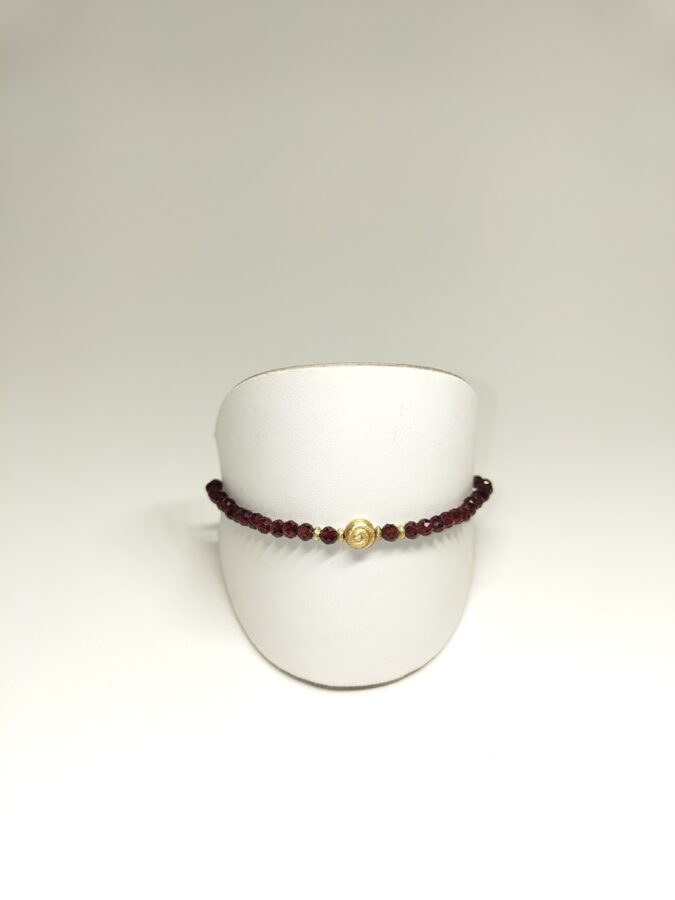 Armband mit der facettierten Kugeln aus Granat (3mm facettiert) und 925 Sterlingsilber gelbvergoldet in Spiralform Durchmesser ~ 0,5 cm. L bis 18 cm. verstellbar.