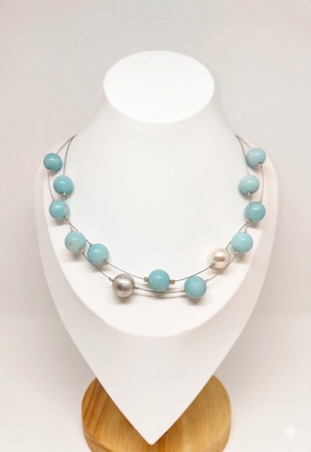 2-reihig Kette aus Amazonit, Muschelperle und Silber , 12mm. Auf Stahlseil gefädelt und mit Silber Teilen fixiert. Verschluss aus 925 Sterling Silber.