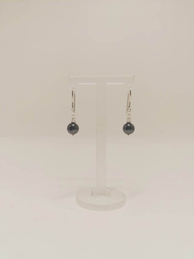 Ohrhänger aus Hämatit ( Blutstein) 8mm, Spinell 3mm, Muschelperle 3mm und Silber. Haken aus 925 Sterling Silber.