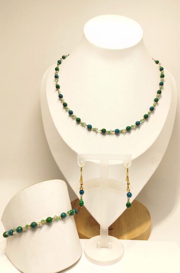 Kette und Armband aus Chrysopras und Sky Apatit facettiert 2mm, Chrysokoll  4mm und Silbervergoldet Kugel 1,8 mm. mit Silbervergoldet Karabiner Verschluss und passende Ohrhänger mit Silbervergoldet Haken.