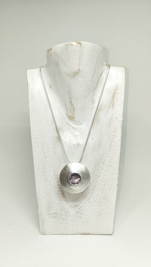 Silber Anhänger mit Amethyst facettiert. Gesamtdurchmesser 3,2 cm; Stein 1,2 cm.