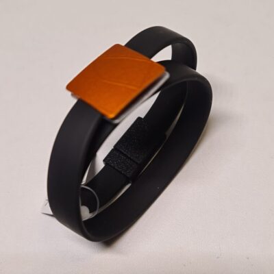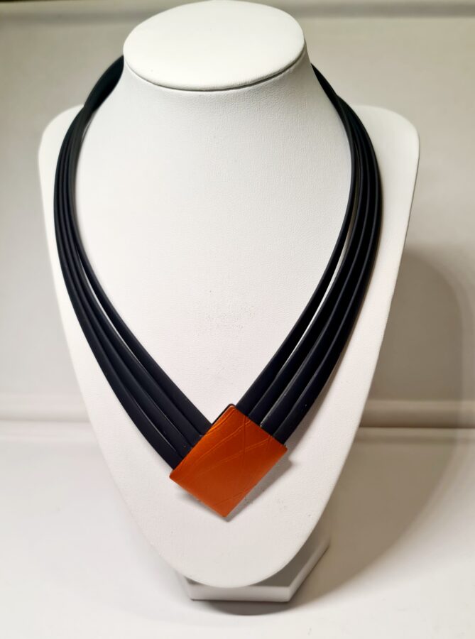 Kautschuk schwarz; Aluminum / orange,silber, 3×4 cm; beidseitig tragbar. Länge ca.45 cm. Magnetverschluß.