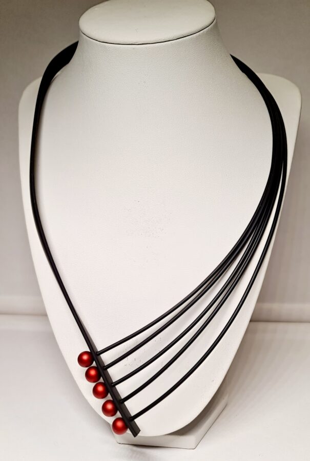 Kautschuk schwarz; Aluminum rot. Kugeln 8mm.Länge ca.52 cm. Magnetverschluß.